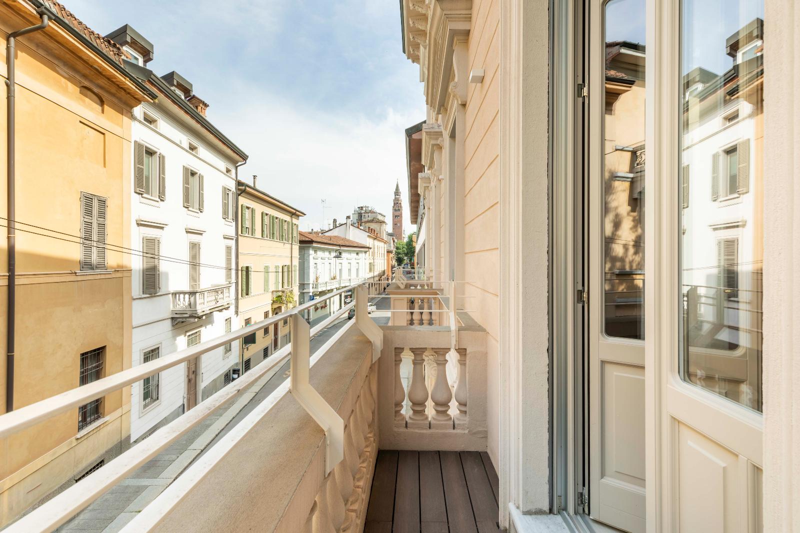 Appartement de deux pièces situé au premier étage, accessible en montant le splendide escalier historique ou par ascenseur. Equipé d'un balcon donnant sur Torrazzo.