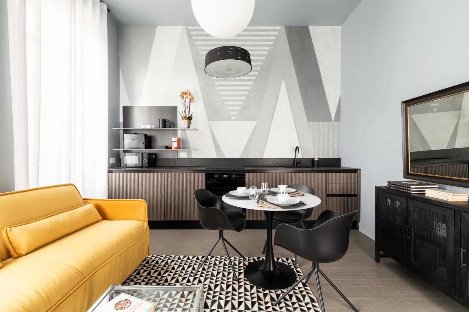 - Angolo cottura: Completamente attrezzato, l'angolo cottura dispone di tutti gli elettrodomestici necessari per preparare i pasti: frigorifero, lavastoviglie, piano cottura, forno a microonde e macchina da caffè.