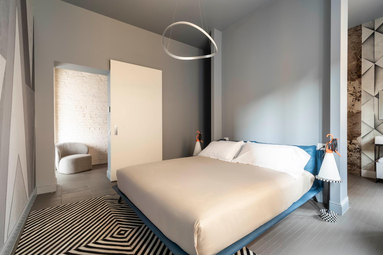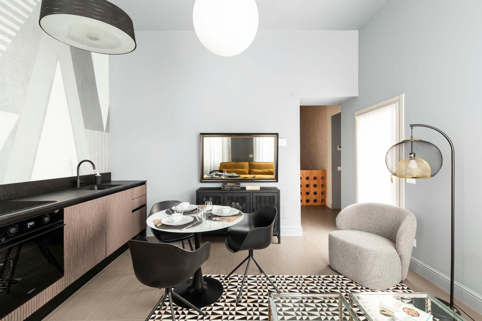 Tutti gli ambienti sono arredati con mobili di design con un richiamo all'epoca storica della struttura.
