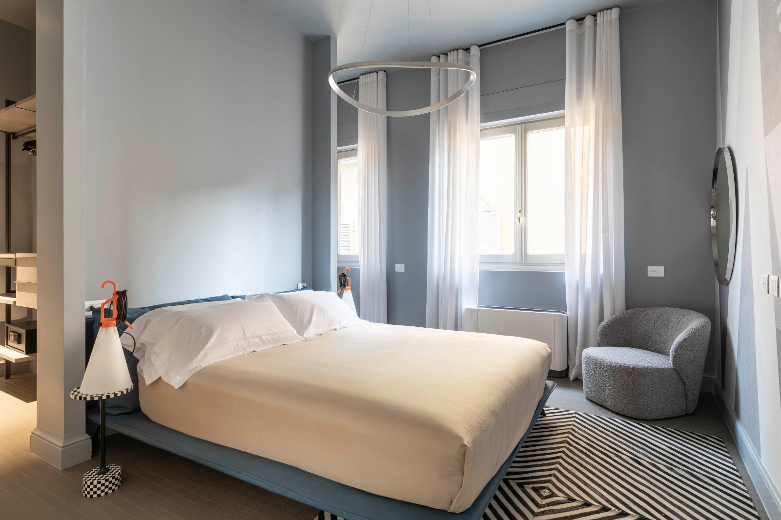 - Zona notte: la zona notte è caratterizzata da un letto matrimoniale queen size, con materasso e topper di alta qualità, completo di biancheria in puro cotone e raso.