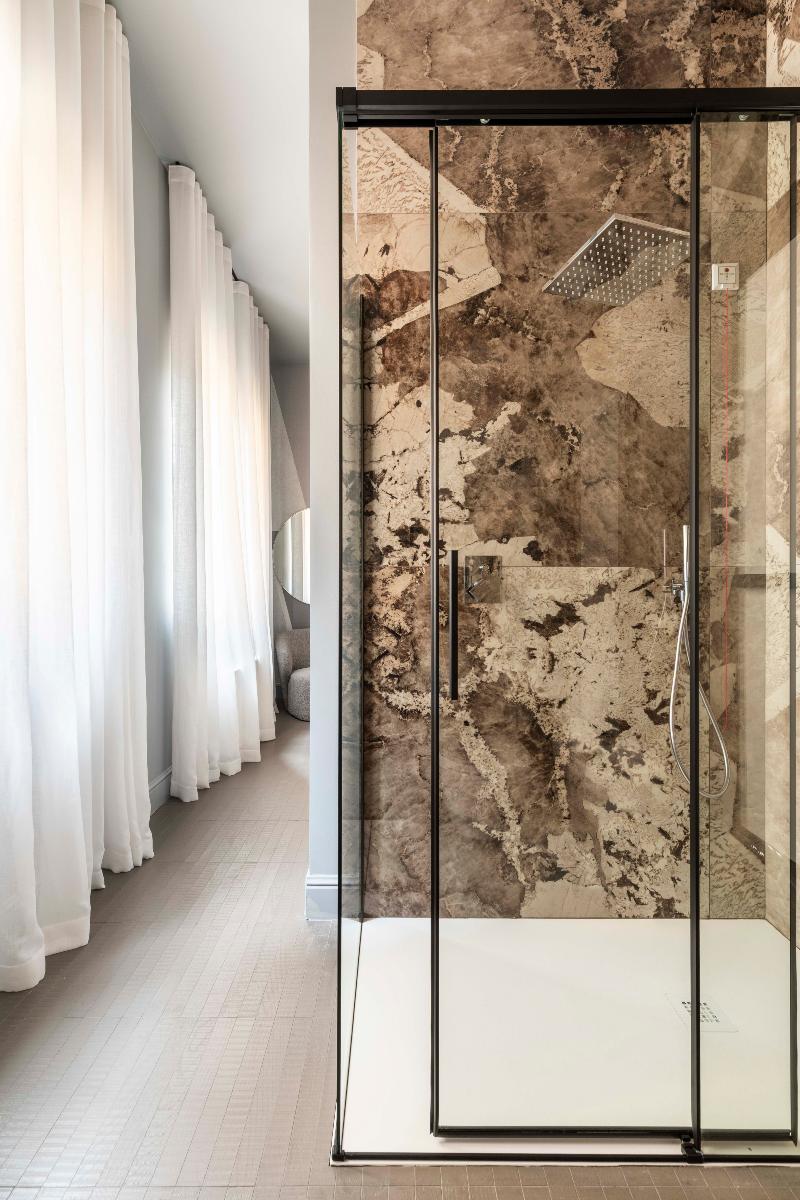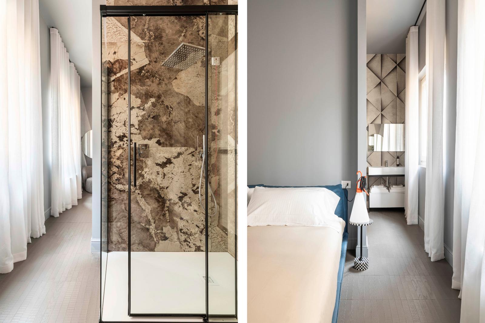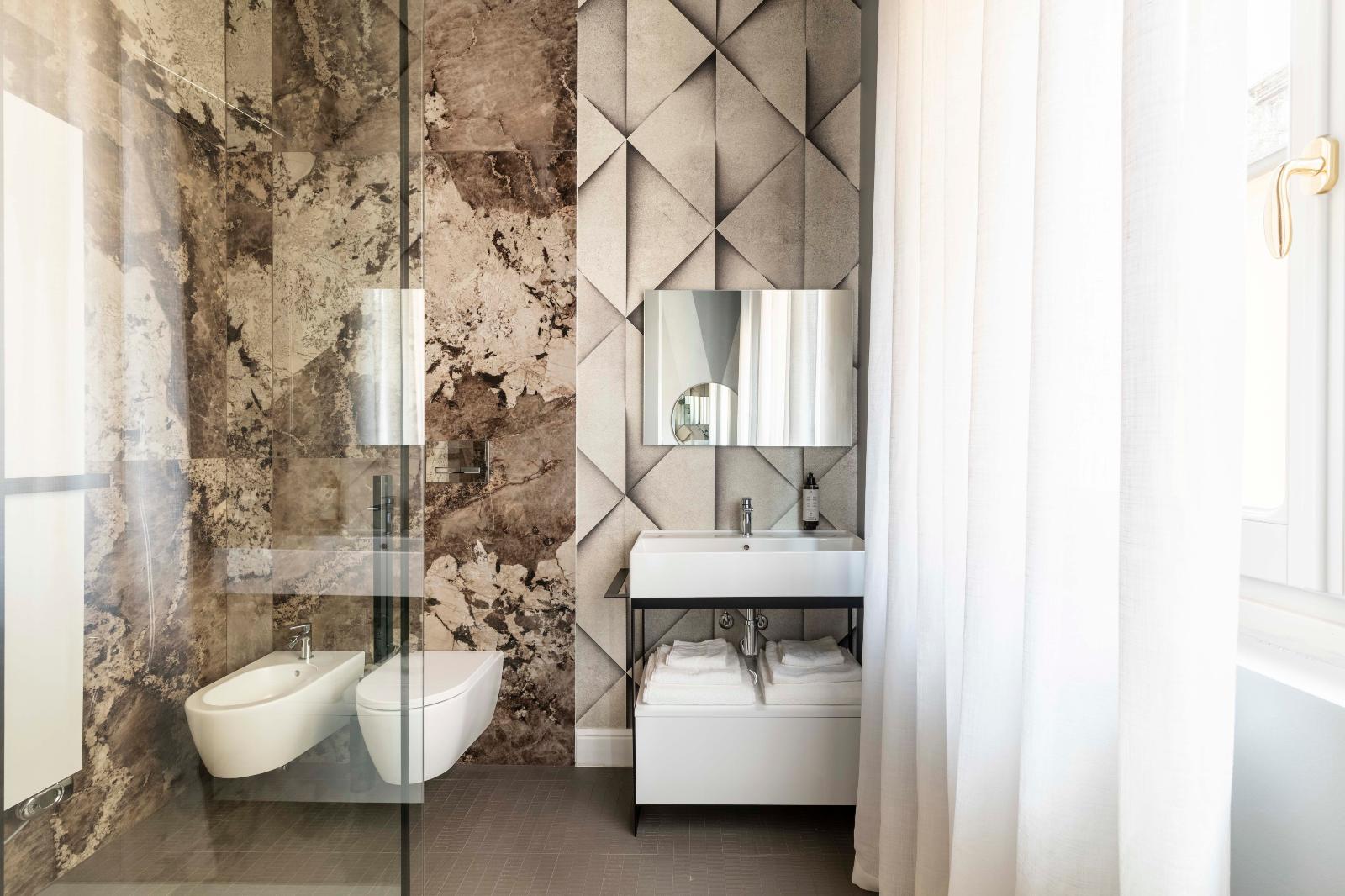 - Bagno: dotato di doccia, vasca, lavabo e sanitari sospesi.